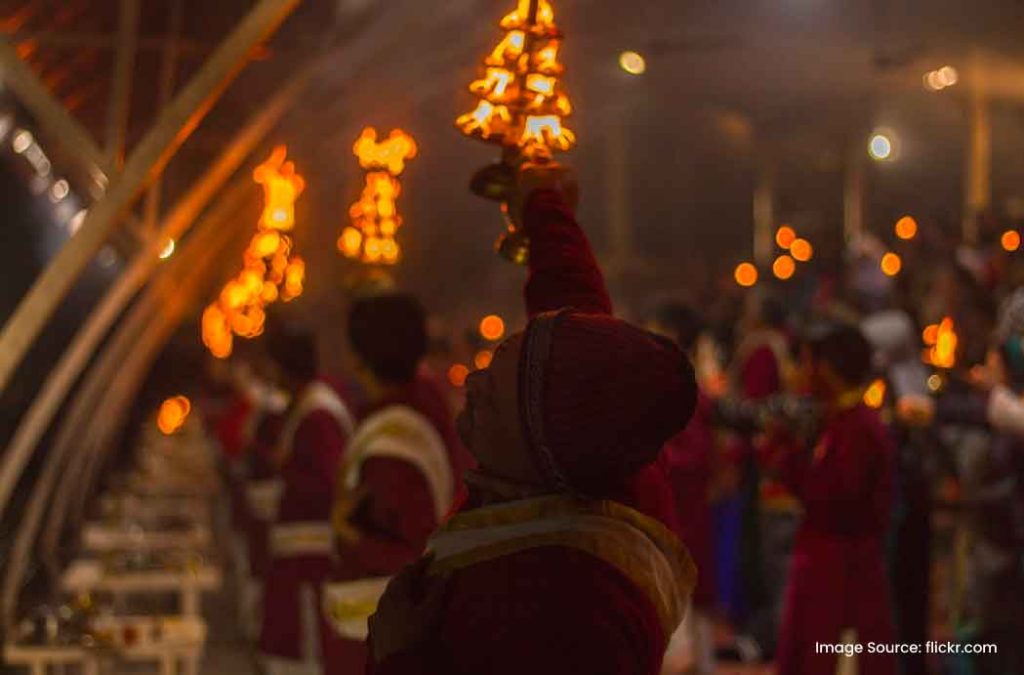 What’s more? The sacred vibes elevate when priests dressed in traditional attire perform synchronised rituals. Multiple large fire lamps are lit and you can hear rhythmic chanting of Vedic hymns. Even devotees sing bhajans and clap rhythmically, everyone syncing on beats.